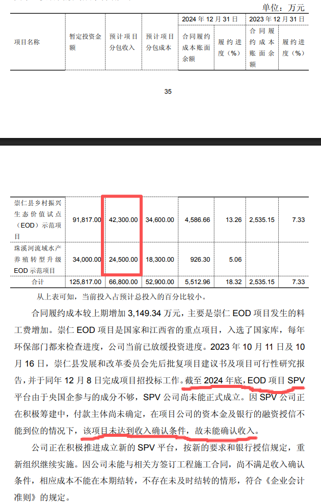 2.江西崇仁项目和海南珠溪河项目,先说崇仁项目,他从24年底就开始停止确认营收,之前22.23年总共确认营收成本是7100万,营业成本还有2.75亿没有确认,这只是成本,按照工程承包毛利率收益10%算,能确认大概营收3个亿,但是这部分24年底就停止了,因为没成立SPV公司,目前我暂未得知成立没,但是一旦成立签施工合同就能确认收入,这笔3个亿的收入少说确认1.5个亿,这是一个隐藏福利,你猜新实控人会不会努力去确认。