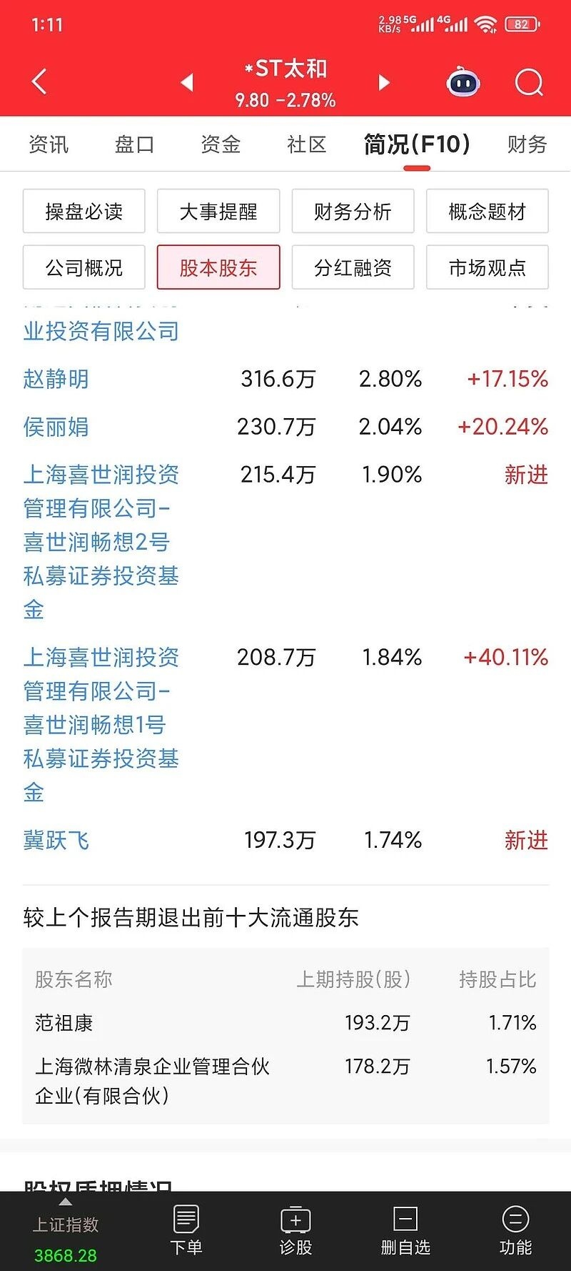 说下股东人数和十大股东,如果都要退市了,那这么群人是傻子吗?股东人数下降的这么厉害,原来的十大股东硬生生被新十大给挤下去了,筹码越来越集中。这里说一下十大股东的比例,每一个季度都是新增的,把原先的十大股东都挤出去了,不代表原先的十大股东跑路了。。所以我确定这个股的集中度应该在60~70%。没点消息,退市的话,谁敢这么大额的加仓,按照现在的成交量,他们想跑不得掉层皮