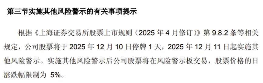 根据本次收到的《事先告知书》认定的情况,公司触及《上海证券交易所股票上市规则(2025 年 4 月修订)》第 9.8.1 条规定的其他风险警示情形,但未触及《上海证券交易所股票上市规则(2025 年 4 月修订)》第 9.5.2 条规定的重大违法类强制退市情形。公司股票12月10日停牌1天,自12月11日起实施其他风险警示。