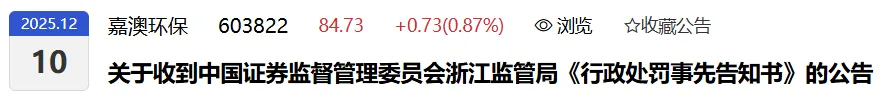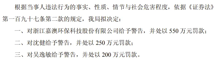 12月9日晚,浙江嘉澳环保科技股份有限公司(603822)公告公司于12月9日收到浙江证监局《行政处罚事先告知书》。截至 2021 年 12 月,嘉澳环保子公司济宁嘉澳鼎新环保新材料有限公司年产 20000 吨环保增塑剂项目试生产结束,已通过项目安全设施竣工验收和项目竣工环境保护验收,并取得《安全生产许可证》,但未按《企业会计准则第 4 号-固定资产》第九条和第十四条、《企业会计准则第 17 号-借款费用》第十三条等规定及时将上述环保增塑剂项目结转至固定资产并计提折旧,也未准确核算相应的借款利息,迟至2024 年6月才进行结转,导致嘉澳环保披露的 2022 年年度报告和2023 年年度报告相关财务数据存在虚假记载。其中,2022 年虚减营业成本 13,444,175.77 元,虚减财务费用 5,767,483.35 元,虚增利润总额 19,211,659.12 元、占当期披露利润总额绝对值的 28.91%,虚增净利润 15,258,202.58 元、占当期披露净利润绝对值的49.06%;2023 年虚减营业成本 13,558,188.38 元,虚增利润总额13,558,188.38 元、占当期披露利润总额绝对值的 63.72%,虚增净利润 10,441,351.18 元、占当期披露净利润的 200.38%,且 2023 年净利润由亏损转为盈利。2025 年4 月29 日,嘉澳环保披露《关于前期会计差错更正的公告》,对前述事项进行了追溯调整。时任董事长兼总经理沈健,负责公司的经营管理,时任财务总监兼董事会秘书吴逸敏,分管嘉澳环保财务和信息披露工作。两人未勤勉谨慎履行职责,未能保证 2022 年年度报告和 2023 年年度报告真实、准确、完整,是嘉澳环保上述信息披露违法违规行为直接负责的主管人员。浙江证监局拟决定:1、对嘉澳环保给予警告,并处以550 万元罚款;2、对沈健给予警告,并处以 250 万元罚款;3、对吴逸敏给予警告,并处以 200 万元罚款。公司及2名责任人合计拟被罚款1000万元。