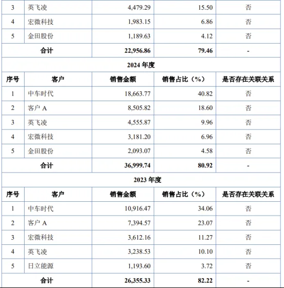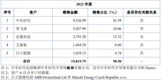 公司主要客户中车时代、客户A、英飞凌、日立能源、斯达半导、宏微科技等均为功率半导体行业内知名企业,规模较大。2022年、2023年、2024年及2025年上半年,公司向前五大客户的销售收入占营业收入的比例分别为90.50%、82.22%、80.92%和 79.46%,客户集中度较高,其中第一大客户中车时代分别贡献公司收入的42.59%、34.06%、40.82%及33.93%。