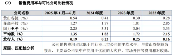 公司将黄山谷捷(301581)、菲高科技(873913)、国力电子(688103)列为可比公司。2022年、2023年、2024年及2025年上半年,这3家可比公司销售费用率平均值为2.15%、1.72%、1.83%及1.35%,而公司的销售费用率分别为0.16%、0.25%、0.23%及0.19%,远低于3家可比公司的平均值且低于任何1家可比公司的销售费用率。公司解释:公司销售费用占比低于同行业上市公司的平均水平,与黄山谷捷较为接近,主要系公司集中产能用于优质的大客户,市场开拓等费用相对较低。