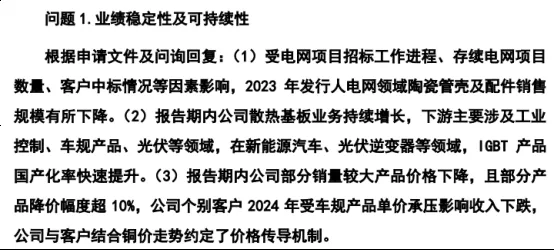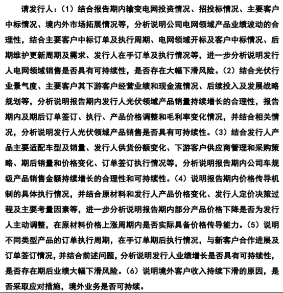 2025年12月12日,公司公布第二轮问询的回复。第二轮问询的核心问题为:业绩稳定性及可持续性。北交所审核中心要求公司:分析说明发行人电网领域销售是否具有可持续性,是否存在大幅下滑风险;分析说明发行人光伏领域产品销售是否具有可持续性;分析说明报告期内公司车规级产品销售金额持续增长的合理性和可持续性;分析说明报告期内部分产品价格下降是否为发行人主动调整,在原材料价格上涨周期内是否实际具备价格传导能力;分析说明发行人业绩增长是否具有可持续性,是否存在期后业绩大幅下滑风险;说明境外客户收入持续下滑的原因,是否采取应对措施,境外业务是否可持续。