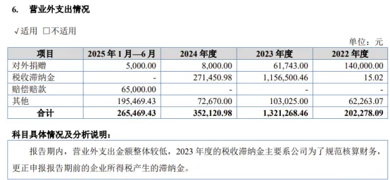 公司解释:2023 年度的税收滞纳金主要系公司为了规范核算财务,更正申报报告期前的企业所得税产生的滞纳金。2025年上半年还有其他营业外支出19.55万元。