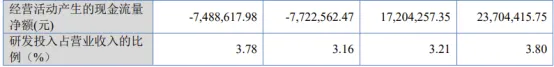 虽然报告期营收、净利润同比增长,但经营活动产生的现金流量净额却出现了不良变化。2022年、2023年,公司经营活动产生的现金流量净额分别为0.237亿元、0.172亿元,到2024年在营收增长42.65%的情况下,经营活动产生的现金流量净额却为-0.077亿元,同比下降145%。2025年上半年,公司经营活动产生的现金流量净额为-0.075亿元,同比下降0.50%。