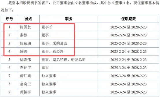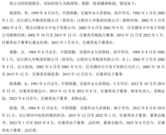 公司控股股东、实际控制人为陈国贤、秦静、陈蓓璐和陈强,四人合计控制公司79.87%表决权。陈国贤与秦静系夫妻,陈蓓璐系陈国贤、秦静女儿,陈蓓璐与陈强系夫妻。陈国贤担任公司董事长,秦静担任公司董事,女儿陈蓓璐担任公司董事、采购总监,女婿陈强担任公司董事总经理,在2023年8月之前还兼任公司董事会秘书。