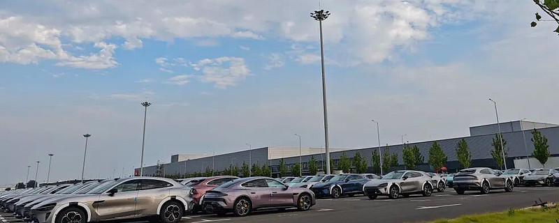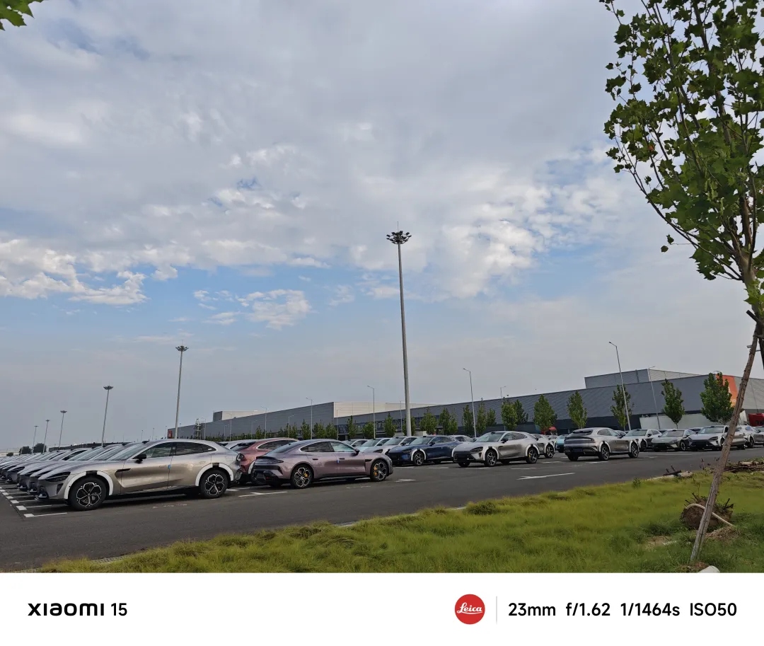 来到一期,我看到令人欣喜的情况。停车场几乎停满了生产好的汽车。一辆又一辆的板车密集地从工厂内满载着小米汽车驶出。