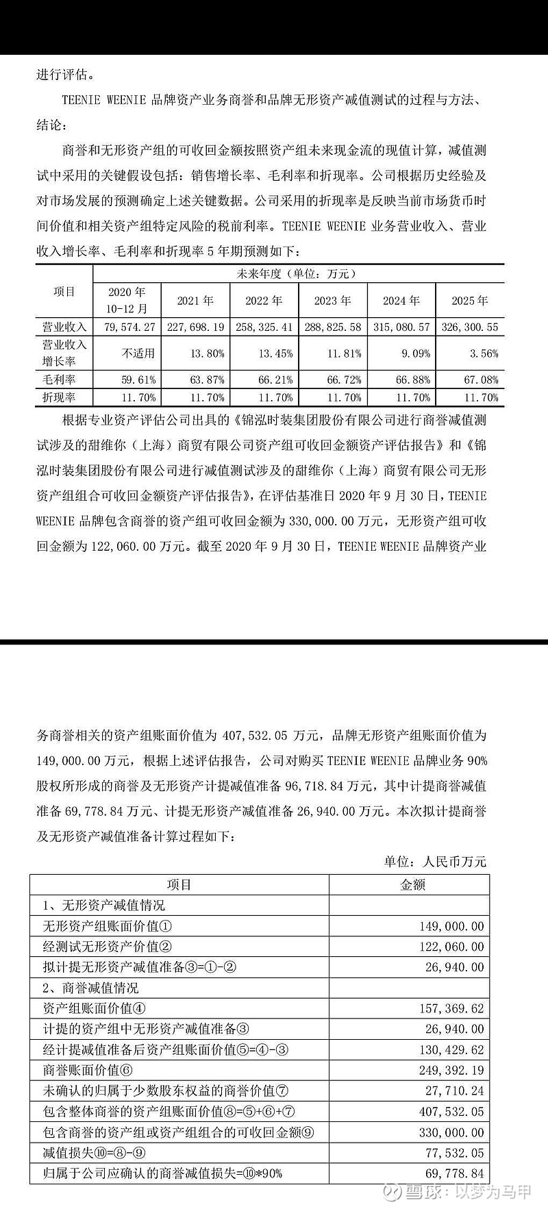 $锦泓集团(SH603518)$ 关于估值,我查了2020年对TW资产进行减值的报告,它依据TW未来五年收入和毛利率的预测值来评估当时TW资产的价值,现在这五年的业绩已经出来了,对比当时的预测显得保守,所以TW这块资产的价值>(购买成本47亿-评估减值9.7亿≈38亿),VG的价值计为零,云锦的价值不好测算,我把云锦在淘宝的关注量和万事利对比,大约是七分之一,所以云锦的价值也计为万事利市值的七分之一,大约7亿。以上,锦泓的估值=38+7=45亿,7折32亿,股价9元,这是很安全的价格。