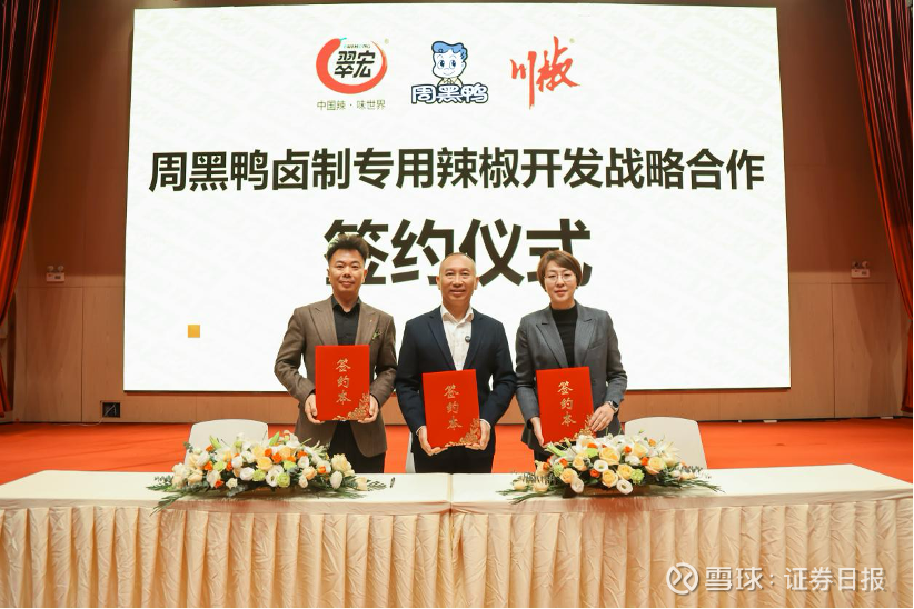 本报讯 (记者梁傲男)11月19日,周黑鸭国际控股有限公司(以下简称“周黑鸭”)卤制专用辣椒开发战略合作签约仪式举行。周黑鸭携手四川翠宏食品有限公司(以下简称“四川翠宏食品”)、四川省川椒种业科技有限责任公司(以下简称“四川川椒种业”)达成深度合作,三方以优势互补为基础、联合创新为核心,共同开发适合卤味产业应用的辣椒新品种,这既是周黑鸭首次布局上游香辛料定制开发,更是卤味行业中首家达成香辛料定向开发的突破性举措。