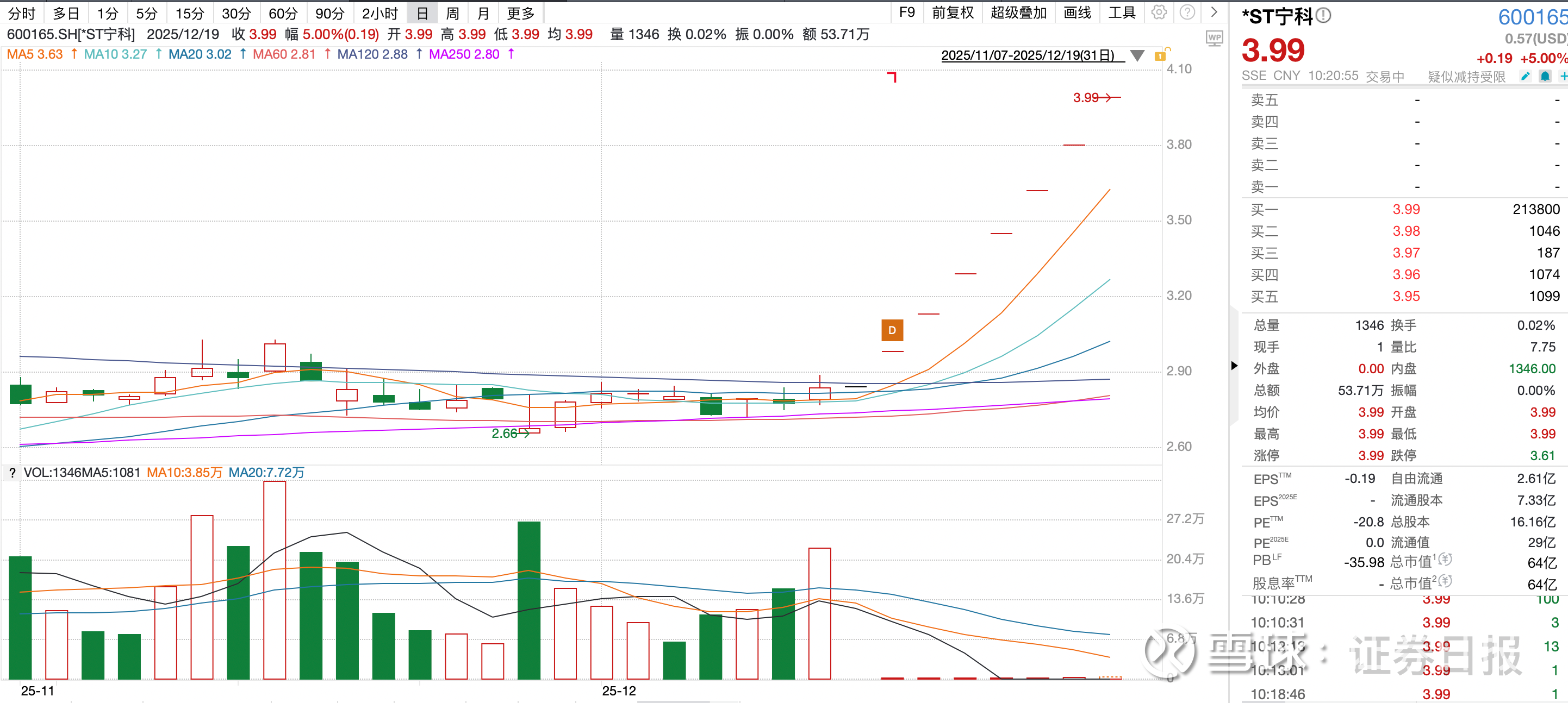 12月19日,宁夏中科生物科技股份有限公司(证券简称:*ST宁科证券代码:600165.SH)开盘后再度一字涨停。截至早盘收盘,公司股价已连续7个交易日涨停,报收3.99元/股。这一强劲表现出现在公司连续发布风险提示公告的背景下,引发市场广泛关注。