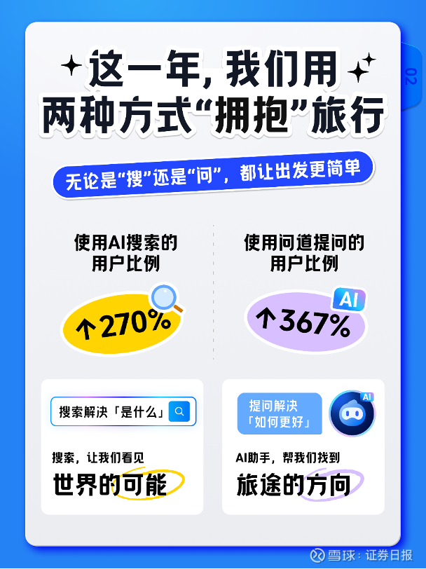 报告数据显示,2025年,在搜索中使用AI规划旅行的用户比例同比提升270%,而深度使用AI问答产品“问道”的用户规模更是同比增长367%。旅行已从单纯的信息查询,演进为情绪调节与生活延伸的重要方式。搜索框负责解决“是什么”,AI对话框开始回应“如何更好”。