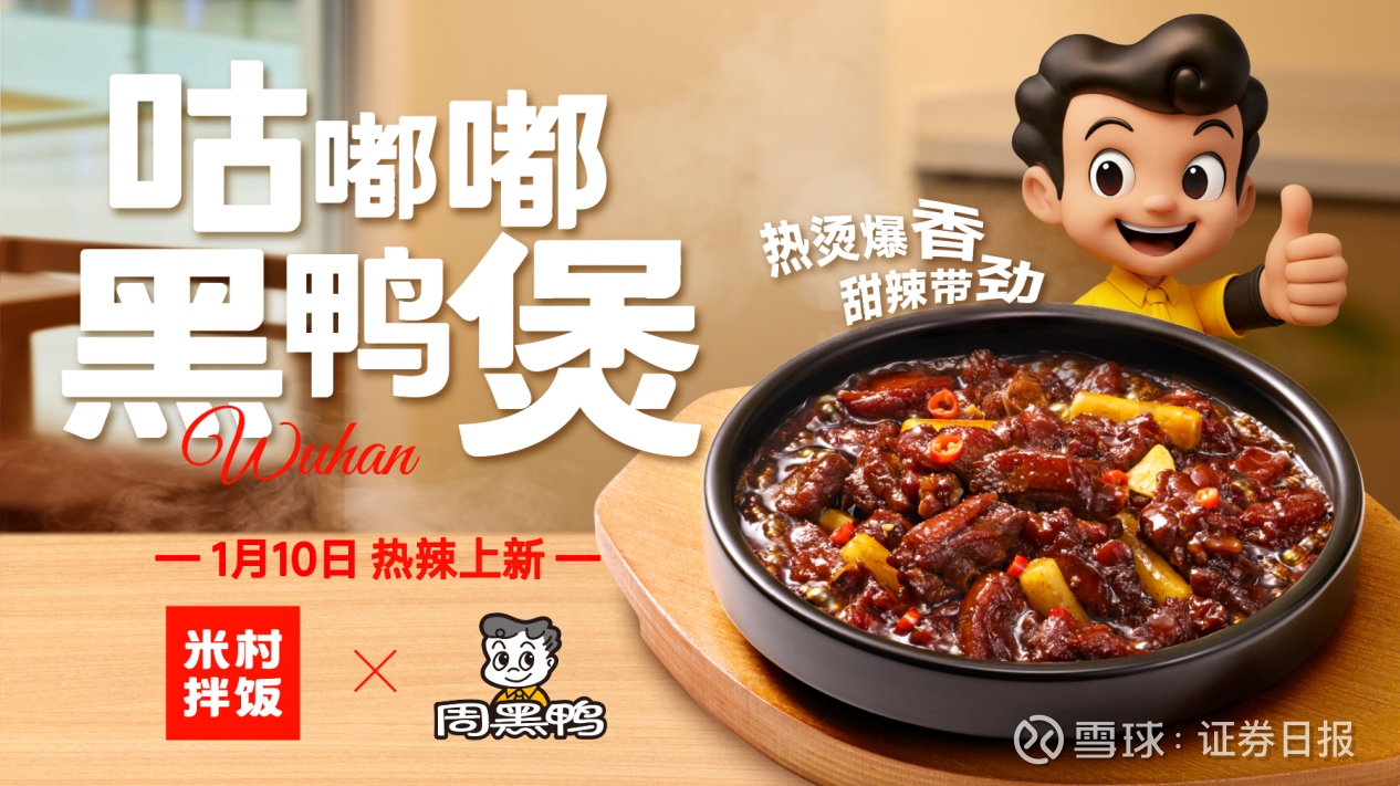 本报讯 (记者李静)1月10日,黑鸭风味开创者周黑鸭与中式快餐品牌米村拌饭正式官宣联名合作,联名新品“咕嘟嘟黑鸭煲”在米村拌饭全国门店重磅上市。此次联名合作不仅实现了休闲卤味与快餐场景的创新融合,也彰显了周黑鸭作为风味开创者,推动黑鸭风味走向多元场景、赋能行业共同发展的开放格局。