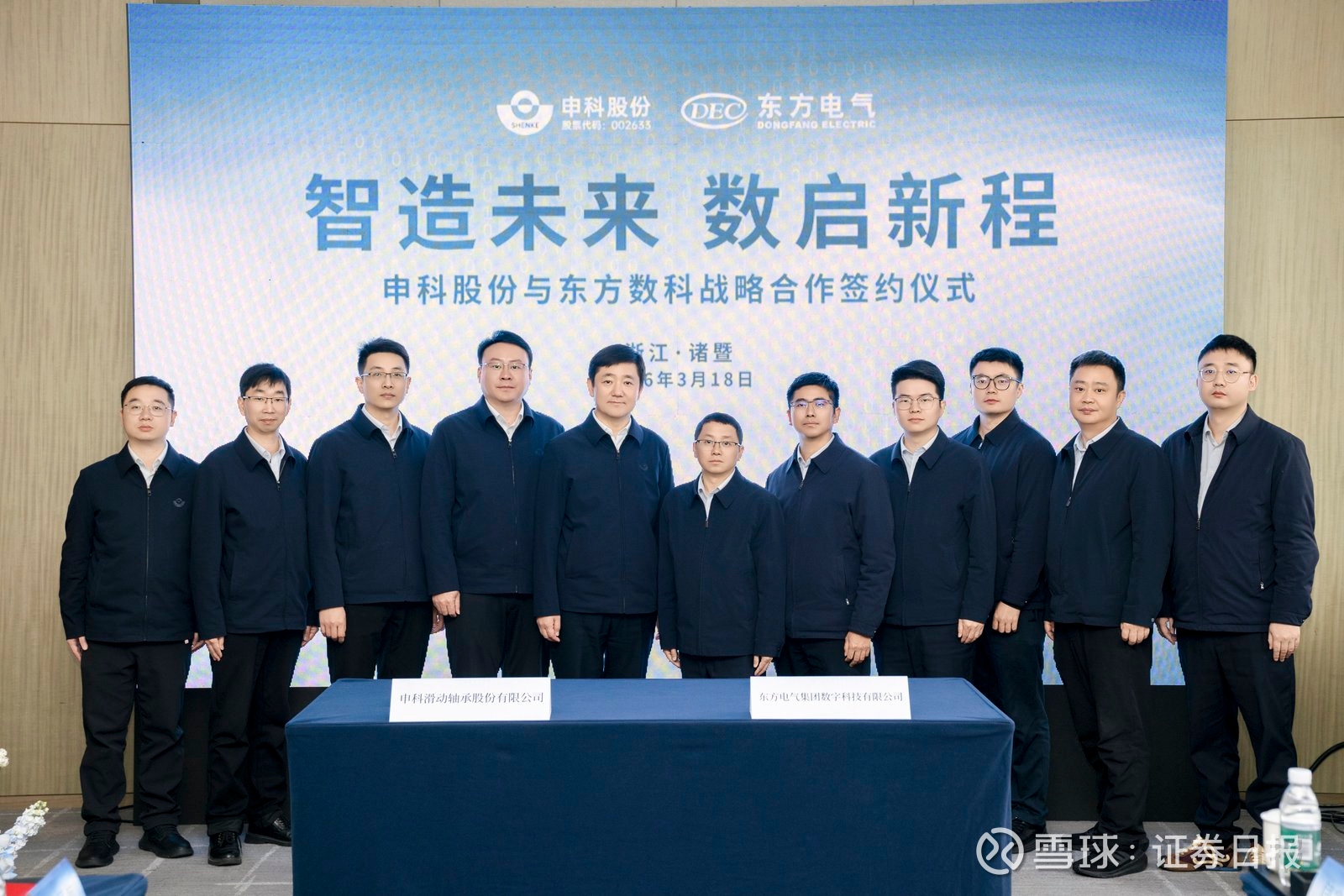 本报讯 (记者冯思婕)3月18日,申科滑动轴承股份有限公司(以下简称“申科股份”)与东方电气集团数字科技有限公司(以下简称“东方数科”)举行战略合作协议签约仪式。双方将围绕高端装备制造能力升级、数字化协同以及“具身智能+智能制造”应用等方向深化合作,推动传统制造能力与新一代数字技术进一步融合。