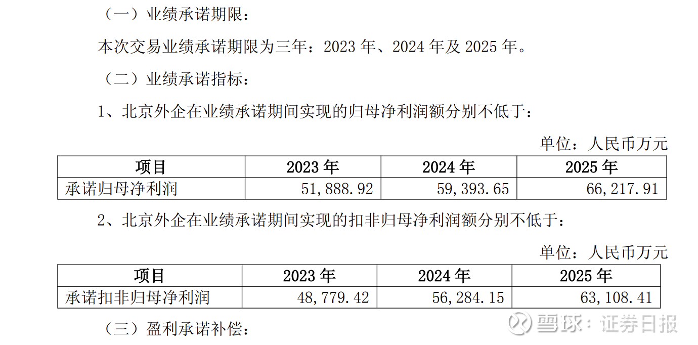 根据北京人力披露的公告显示,协议的业绩承诺期限为2023年、2024年及2025年,分别对应5.2亿元、5.9亿元、6.6亿元的承诺归母净利润;4.9亿元、5.6亿元、6.3亿元承诺扣非归母净利润。