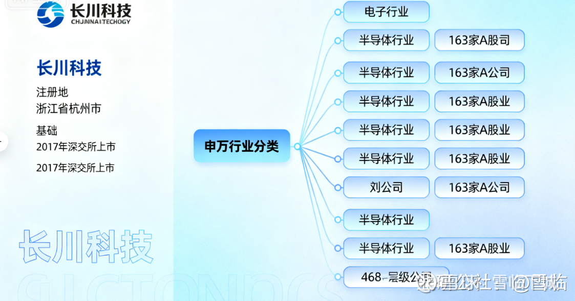 根据申万行业分类标准,公司一级行业属于电子行业,这个行业目前有六个二级行业共468家上市公司。长川科技属于其中的半导体行业,目前这个行业总共有163家A股上市公司。