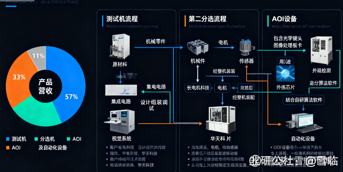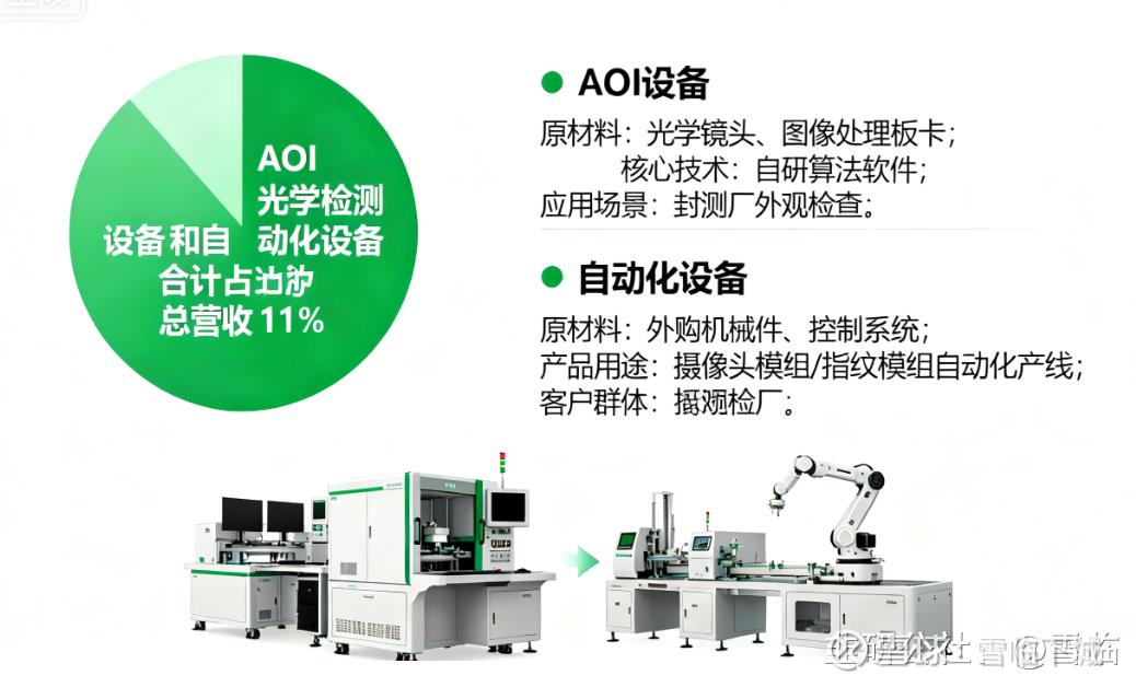 剩下11%的营收来自AOI光学检测设备和自动化设备。AOI的原材料主要是光学镜头、图像处理、板卡,公司自己写算法做软件,做完以后卖给封测厂做外观检查。自动化设备就是帮客户做摄像头模组、指纹模组的自动化产线,原材料也是外购的机械件和控制系统,最后卖给模组厂。