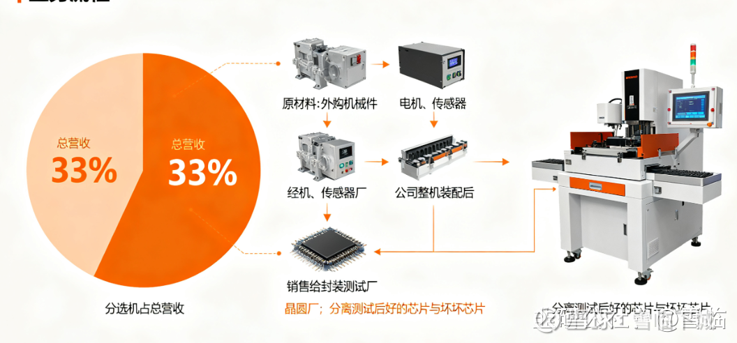 第二大产品是分选机,占总营收的33%。分选机的原材料跟测试机差不多,也是外购机械件、电机、传感器的,公司把零部件装成整机后,同样卖给封装测试厂和晶圆厂,用来把测完的好芯片和坏芯片分开。
