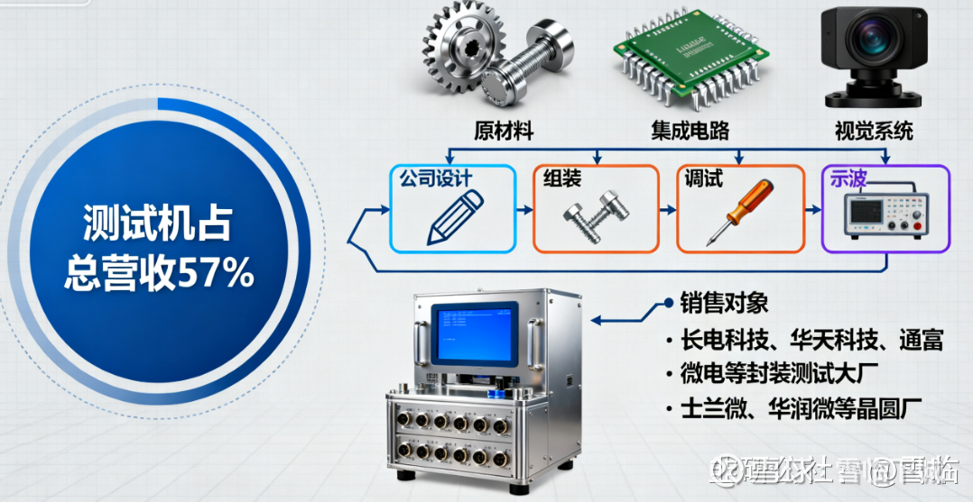 最重要的产品是测试机,这块业务占总营收的57%。测试机的生产过程是从供应商那里买机械零件、集成电路、视觉系统等原材料,然后由公司自己设计、组装、调试,最后卖给长电科技、华天科技、通富微电这些封装测试大厂,也卖给士兰微、华润微这类晶圆厂。