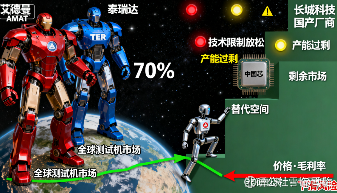 全球测试机市场被爱德曼和泰瑞达两大巨头占据。长川科技等国产厂商只能在剩余市场中争夺替代空间。国产替代虽然带来了红利,但公司尚未获得真正的定价权。一旦海外技术限制放松或行业产能过剩,价格和毛利率将面临快速下滑的风险。