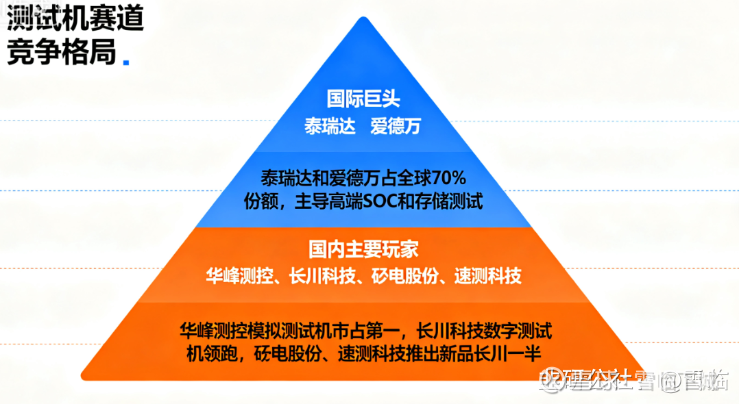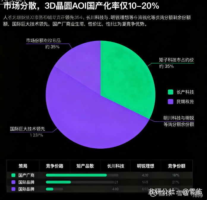 AOI更分散,3D晶圆AOI国产化率只有10%到20%。矩子科技先跑一步市占约35%,长川科技和明锐理想等企业瓜分剩余份额。国际巨头技术领先,国产厂商主要靠性价比切入。综合来看,长川的对手分三层,顶层是泰瑞达、爱德万、科休这些国际巨头,技术加品牌壁垒高。中间是华丰、鸿劲、金海通这批国产同行拼产品、拼交付。底层还有大量小公司用低价抢单。