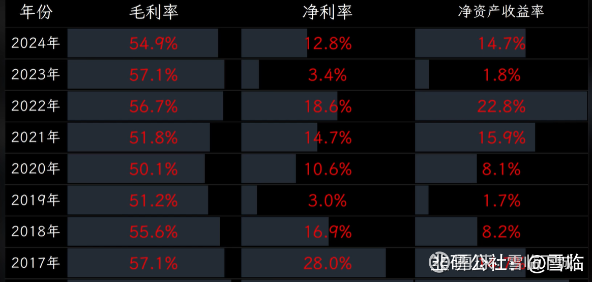 公司毛利率微降至55%,不过还是显著优于行业平均水平。净利率由2023年的3.4%跃升至12.8%,净资产收益率从1.8%提升到14.7%,回升了将近13个百点,盈利指标改善明显。