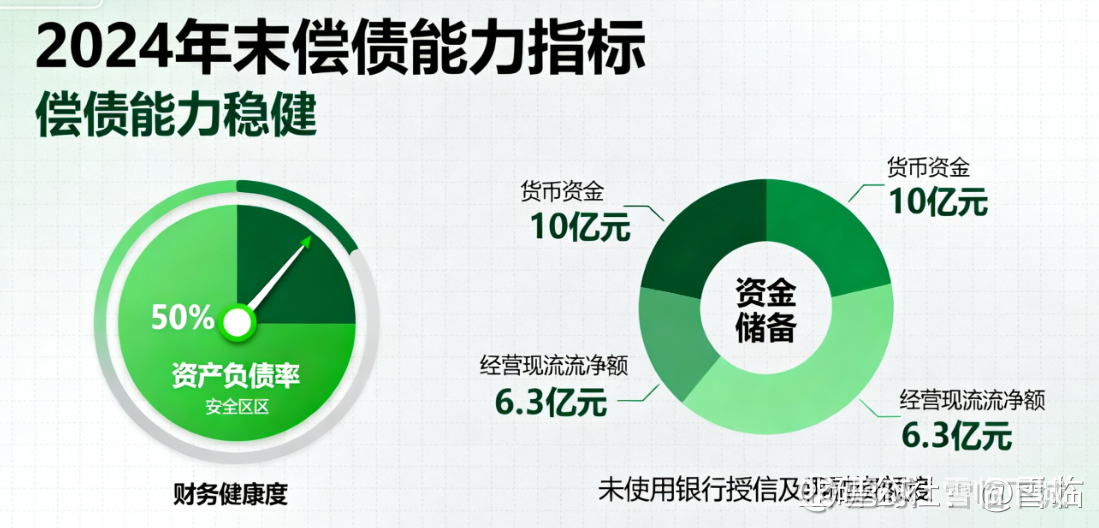 2024年末,公司资产负债率50%,流动比率1.8,账上货币资金10亿元,经营现金流净额6.3亿元,叠加未使用的银行授信和再融资额度,本债偿还与利息支付保充足,整体偿债能力稳健。