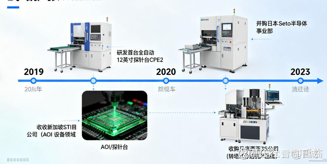 2019年公司收购了新加坡STI公司,这是一家专注于光学检测技术的企业,也就是做AOI设备。AOI设备就像给芯片做视力检查,用光学相机检测晶圆和芯片封装的外观是否有缺陷。这次收购让长川科技进入了AOI设备领域,同年公司还研发了首台全自动12英寸探针台CPE2。探针台主要用于晶圆测试,即在芯片还未切割封装之前,用细微的探针接触芯片上的焊点进行电性能测试。