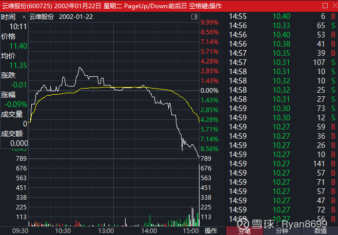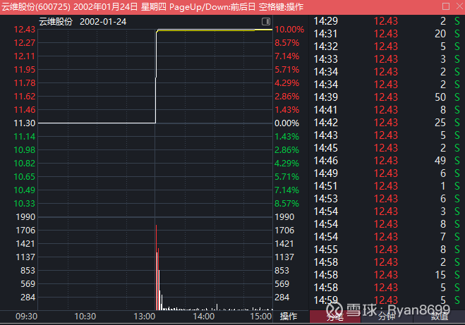 股价在2001.5.18创下19.55阶段高点后就一路阴跌,经过9个月的下跌,股价几乎腰斩,当我看到2002.1.21的-5.07%,1.22尾盘杀到跌停,1.23在10:10杀到跌停时,情绪瞬间就崩溃了,以为天马上就要塌下来,10:15在跌停板挂单卖出,10:17跌停板就打开,10:29短暂封回跌停板,后面很快打开,慢慢振荡向上,下午临近收盘拉至涨停,1.24又是涨停,当时的情绪几近崩溃。