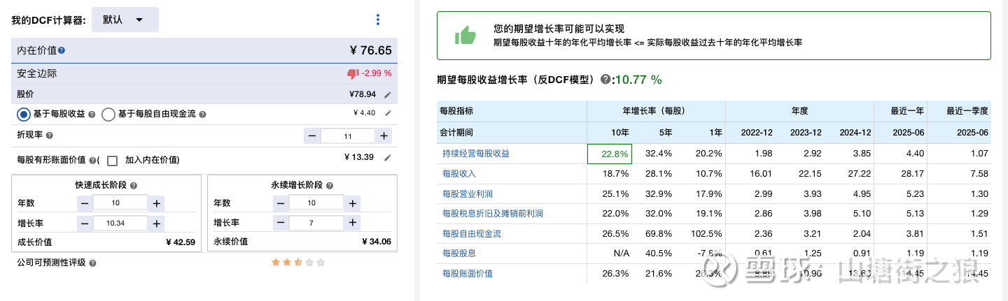 全年推测增长率只有10.34%, 如果珀莱雅可以保持10年10.34%的未来增长率,用DCF来推算的话,即使近期回调超过10%,其股价依然高估。(是的,我就是没预料到增长率下降这么快!)