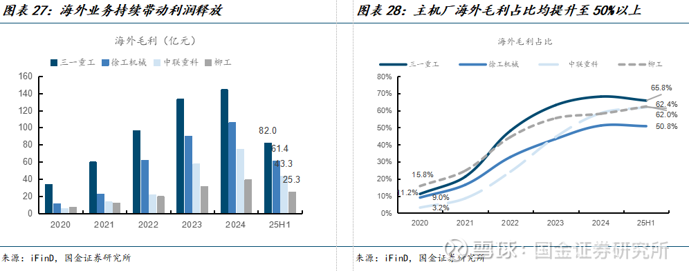海外业务增长带动利润释放。25H1三一重工、徐工机械、中联重科、柳工海外毛利占比分别为65.8%、50.8%、62.0%、62.4%,相对海外收入占比分别高7.1pct、4.2pct、6.4pct、15.5pct,海外是工程机械厂商利润释放的核心环节之一。