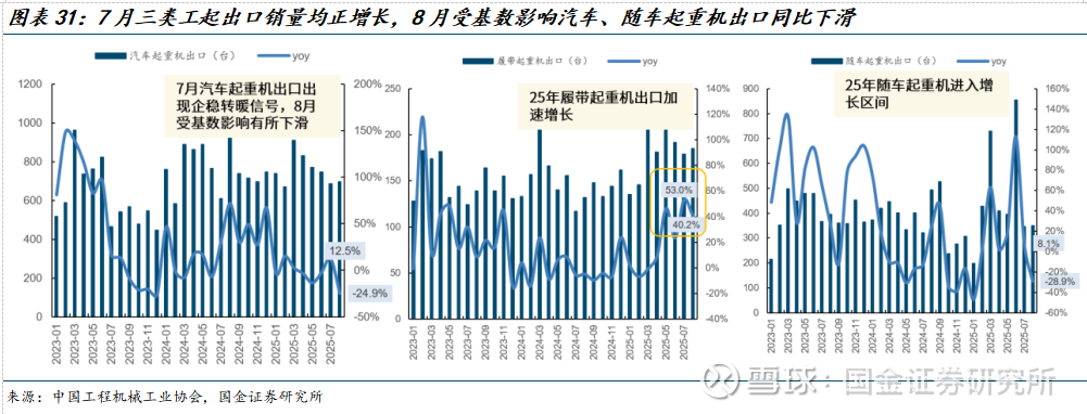 25年1月-8月履带起重机、随车起重机出口保持高增长。25年1月-8月汽车起重机、履带起重机、随车起重机出口销量增速分别为-3.8%、+18.1%、+16.4%,履带起重机、随车起重机出口保持高增长。