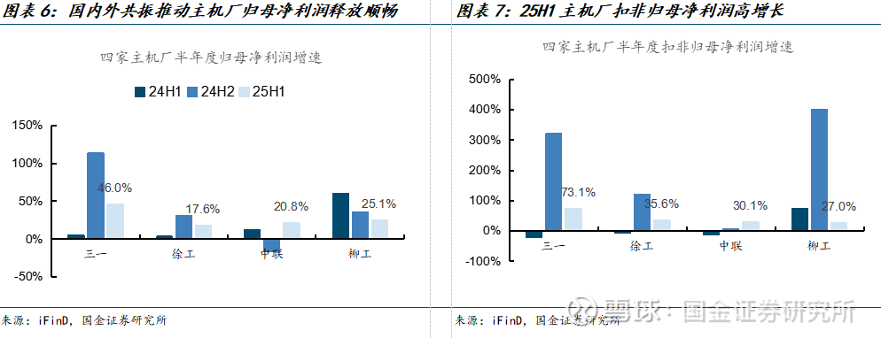 内外销共振带动利润释放。1)国内:三一重工、柳工国内持续增长,徐工机械国内转正、中联重科国内降幅收窄,从主机厂上半年表现来看,工程机械国内拖累减少,并开始贡献利润增量。2)海外:上半年四家头部主机厂海外收入增速在10%-17%,高毛利业务带动利润释放。25H1三一重工、徐工机械、中联重科、柳工扣非归母净利润增速分别为73.1%、35.6%、30.1%、27.0%。