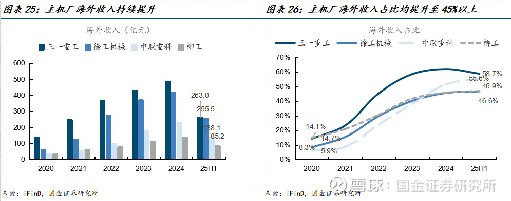全球化纵深挺进,主机厂海外收入规模持续扩张,海外收入占比均提升至45%以上。近年来,国内工程机械厂商持续推进全球化战略,海外收入持续扩张,海外收入占比大幅提升,从20年的5%-15%提升至25H1的45%以上,其中三一重工25H1海外收入占比提升至58.7%。