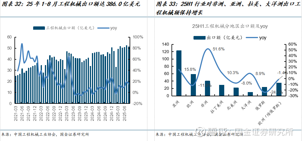 1-8月工程机械出口累计增速达11.4%。25年1-8月工程机械出口额达386.0亿美元,同比+11.4%;月度角度来看,8月出口额达51.2亿美元,同比+15.4%,表现优于累计增速,工程机械出口增速在扩张。
