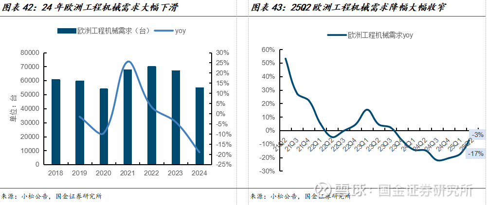 24年需求大幅下滑后,欧洲需求开始迎修复。受欧洲房地产领域需求下滑、大选影响,24年欧洲工程机械进一步大幅下滑,跌至2020年的水平。在经历2年多的下行后,25Q2欧洲地区工程机械需求降幅环比25Q1大幅收窄,显示积极信号。