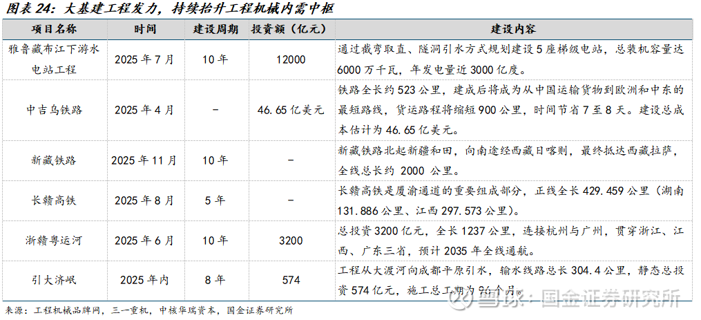 大基建工程发力,持续抬升工程机械内需中枢。25年国内陆续推动多个大基建项目建设,除了雅江水电站、30万公里农村公路新改建项目,还包括中吉乌铁路、新藏铁路、浙赣粤运河等多个大基建工程陆续开工,有望抬升工程机械内需中枢。