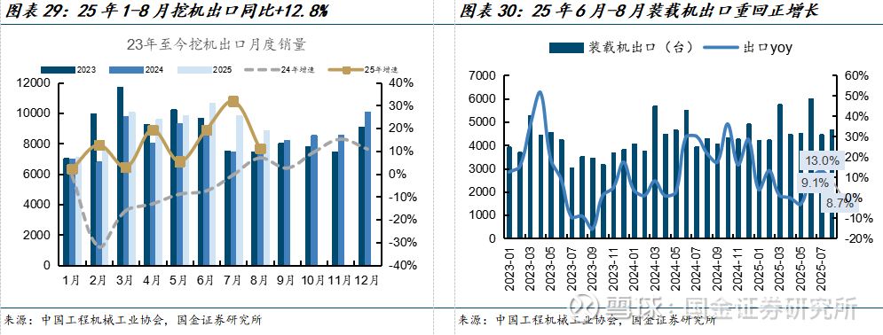 挖机、装载机出口保持稳健。东南亚、中东、非洲、欧洲等区域需求拉动,25年1-8月挖机出口销量为7.36万台,同比+12.8%,其中8月出口为8838台,同比+11.1%,保持双位数增长。25年1-8月装载机出口销量为3.83万台,同比+5.3%,其中7月、8月增速分别为13.0%、8.7%。