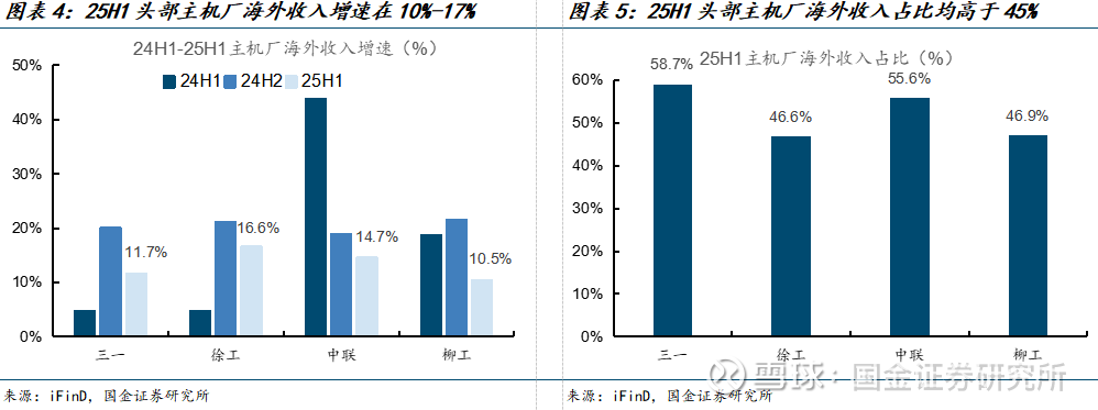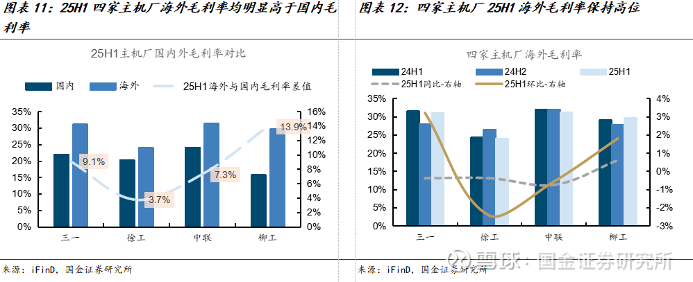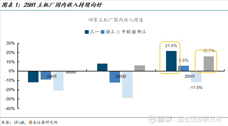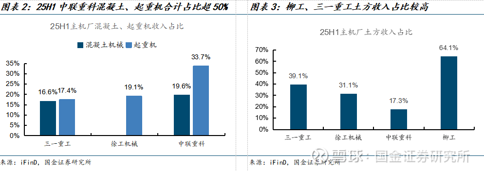 25H1头部主机厂国内收入持续向好。25H1三一重工、柳工、徐工机械、中联重科国内收入增速分别为21.4%、15.7%、5.5%、-11.6%。以挖机为首的土方板块保持增长,带动土方占比高的公司上半年国内收入增长,徐工机械终于实现3年来国内收入正增长,进入拐点。