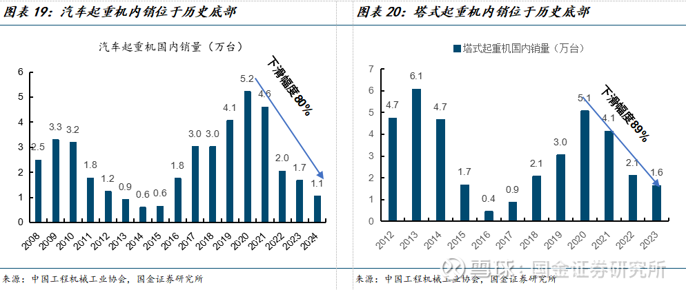 非挖板块处于历史底部。根据工程机械工业协会数据,24年汽车起重机、塔式起重机内销分别为1.1万台、0.5万台,相对20年高点分别下滑80%、89%,接近历史底部区域,考虑到7、8月连续两个月工程起重机加速回暖、8月塔机内销下滑环比收窄,看好非挖板块逐步走出底部。