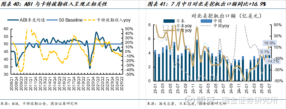 降息有望拉动建筑开支,进而拉动工程机械需求。ABI(建筑开支指数)与卡特彼勒收入呈现正相关性,降息→房产需求→ABI上升→工程机械需求提升,看好北美明后年工程机械需求。