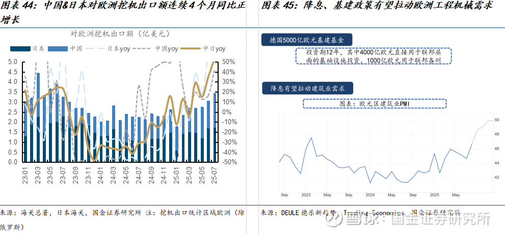 欧洲短期需求景气度或已进入上行期。中日对欧洲挖机出口额在25年4月-7月实现连续四个月同比正增长,其中6、7月增速为34.6%、53.1%,加速增长,反映出欧洲地区需求或已经拐点向上。2023-24年下行期库存消耗+降息拉动建筑市场需求+基建政策,有望支撑欧洲工程机械中长期增长。