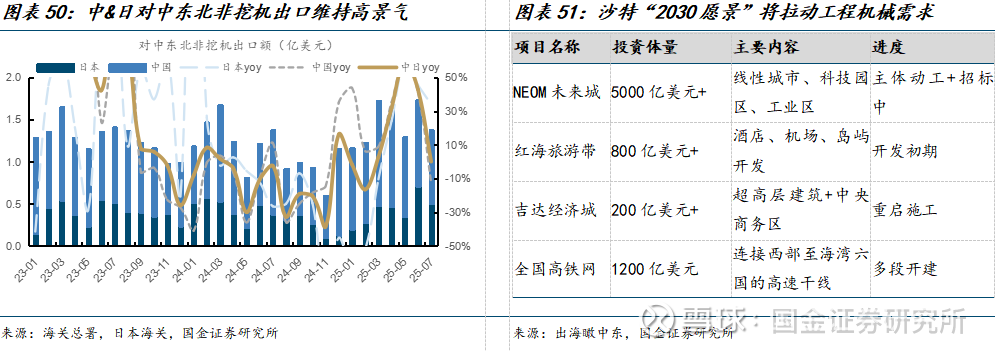 中东北非工程机械需求有望维持高景气。25年3月-7月中&日对中东北非挖机出口维持正增长,中东地区受房地产开发、沙特“2030愿景”等拉动,工程机械需求有望维持景气。