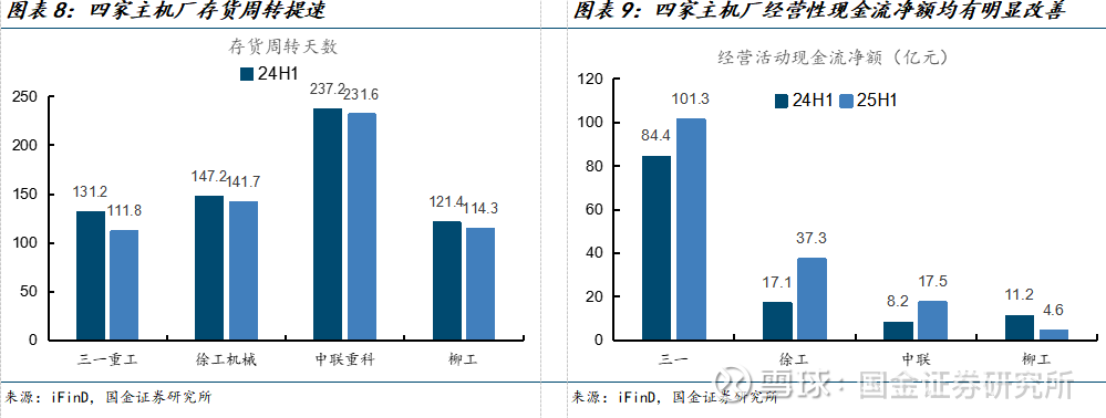 看好内外销共振带动公司规模增长、利润释放、经营质量继续提升。25H1头部主机厂经营性现金流持续增长,其中徐工、中联均实现翻倍以上增长,四大主机厂25H1存货周转天数均同比降低。看好内外销持续共振带动工程机械厂商规模增长、利润释放、经营质量继续提升。