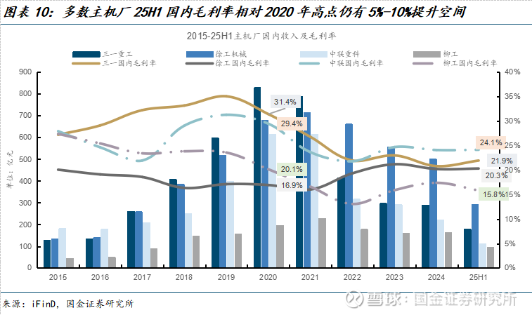 国内:25H1土方内销表现仍然强势,工程起重机等非土方板块回暖的板块开始增多,25H1三一重工、柳工、徐工、中联重科内收入增速分别为21.4%、15.7%、5.5%、-11.6%。头部主机厂25H1国内毛利率相对20年高点低5%-10%,预计随着非土方上行,内销有望为工程机械厂商贡献更多业绩弹性。