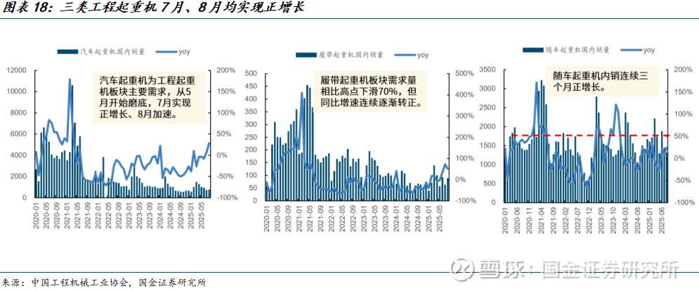 更新周期支撑土方增长,非土方有望筑底向上。1)土方:在6-8月份开工率明显下滑的情况下,挖机内销增速分别为+6.2%、+17.2%、+14.8%,二手机出口消纳国内存量,挖机更新需求有望持续释放,我们测算23-27年挖掘机更新需求分别为7.9、9.2、14.3、19.5、24.9万台,预计明年还会加速增长。2)非土方:25年7、8月三类工起内销同频增长,其中8月汽车起重机、随车起重机内销加速扩张;长周期角度来看,起重机、混凝土等非土方产品启动滞后挖机2年左右,目前挖机已经领先非土方1年半增长,看好非土方内销逐步进入上行期。3)大基建推进,看好内需向上:7月总投资1.2万亿的雅江水电站项目、8月30万公里农村公路新改建项目、新藏铁路等多个大型基建项目陆续开工,有望拉动土方、混凝土、起重机等多类工程机械需求,看好大基建抬升工程机械需求中枢。