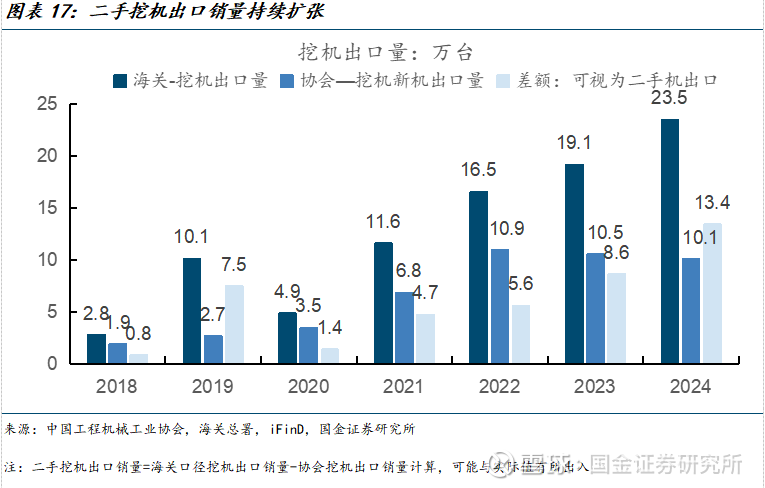 二手机出口消纳挖机保有量,倒逼更新需求释放。根据二手挖机出口销量=海关口径挖机出口销量-协会挖机出口销量进行计算,23、24年二手挖机出口为8.6、13.4万台(与真实值或存在差异),二手挖机销量扩张,消纳了国内市场的挖机保有量。并且,行业对外出口的二手挖机主要是适龄的“优质机”,或将导致国内存量的优质机进一步减少,有望倒逼更新需求释放。
