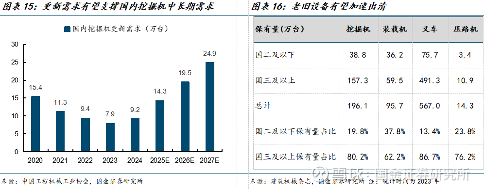 更新周期:根据挖掘机更新周期为8年左右测算,25、26、27年国内挖掘机更新需求为14.3、19.5、24.9万台。核心假设: