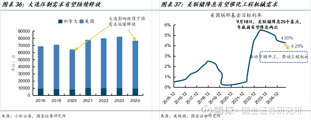 大选后需求释放和降息有望成为北美市场上行两大支撑。1)大选后市场复苏:2020年、2024年为欧美大选年,下游客户或因大选滞后资本开支计划,一定程度延缓了工程机械需求,25年大选后确定性增强,下游需求因大选延缓的需求有望陆续释放。2)降息有望催化工程机械需求:9月18日,美联储降息25个基点,联邦基金目标利率降至4.25%,并暗示年底前还将再降息两次,降息有望拉动北美工程机械需求。