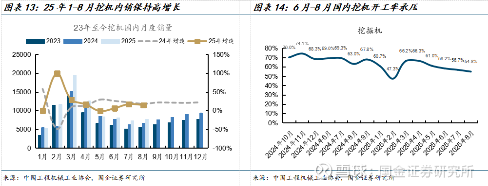 开工率承压背景下,更新周期在演绎。从高频的开工率来看,6月-8月国内挖机开工率分别为58.2%、56.7%、54.8%,同比-10.8pct、-12.6pct、-8.2pct,开工率持续承压;25年1-8月挖机内销为8.06万台,同比+21.5%,8月挖机内销为7685台,同比+14.8%,在开工承压背景下,挖机内销维持高增长,看好更新周期支撑下,挖机内销长周期稳健上行。