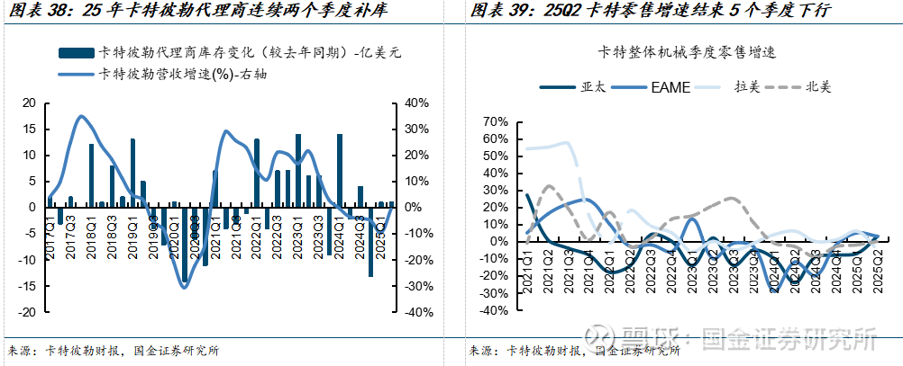 卡特视角——北美下行期或已结束。1)代理商库存:发达地区市场需求波动受大选等政治活动影响,大选年后,25年卡特彼勒连续两个季度补库;2)零售:从零售端来看,25Q2卡特北美地区零售实现同比持平,结束长达5个季度的下行。